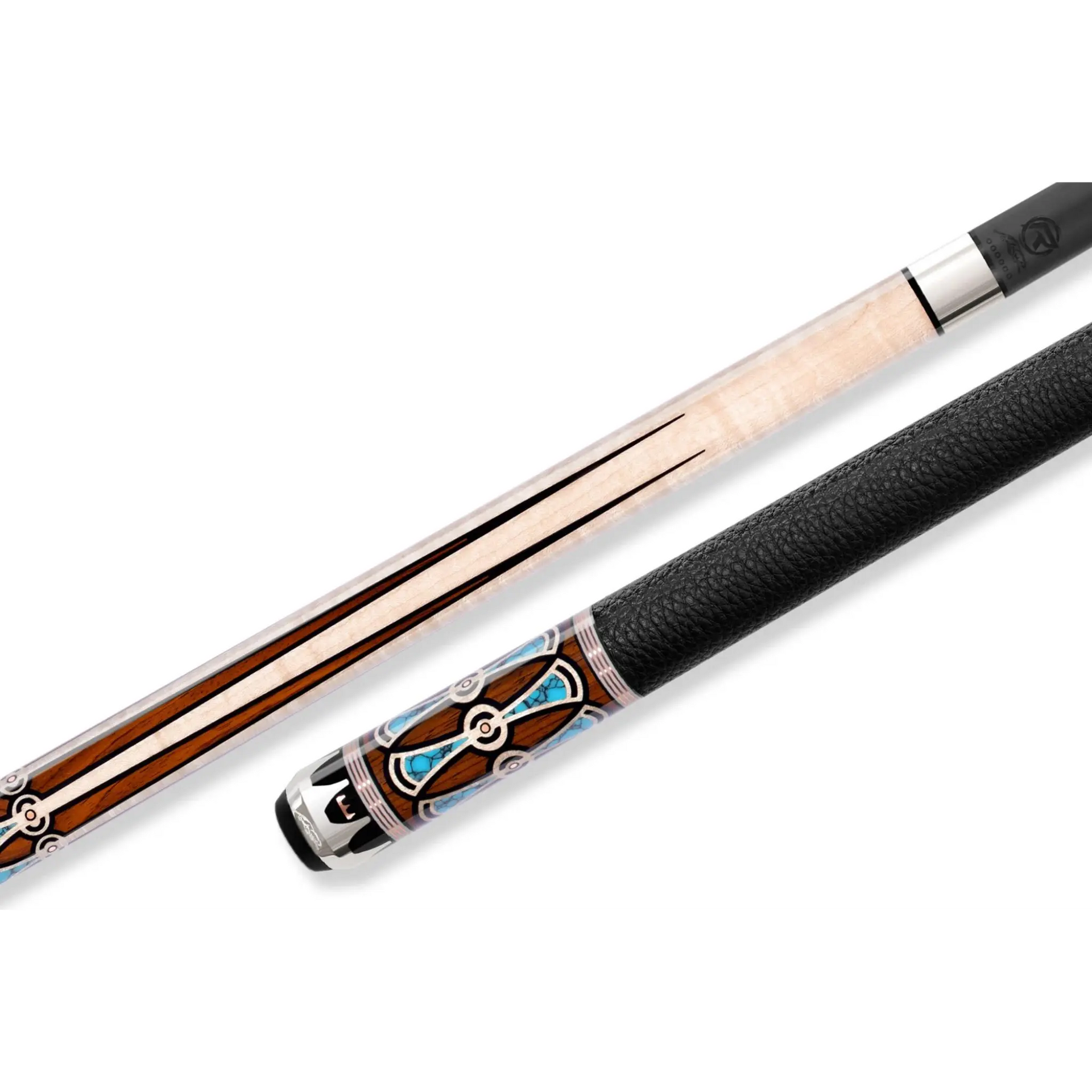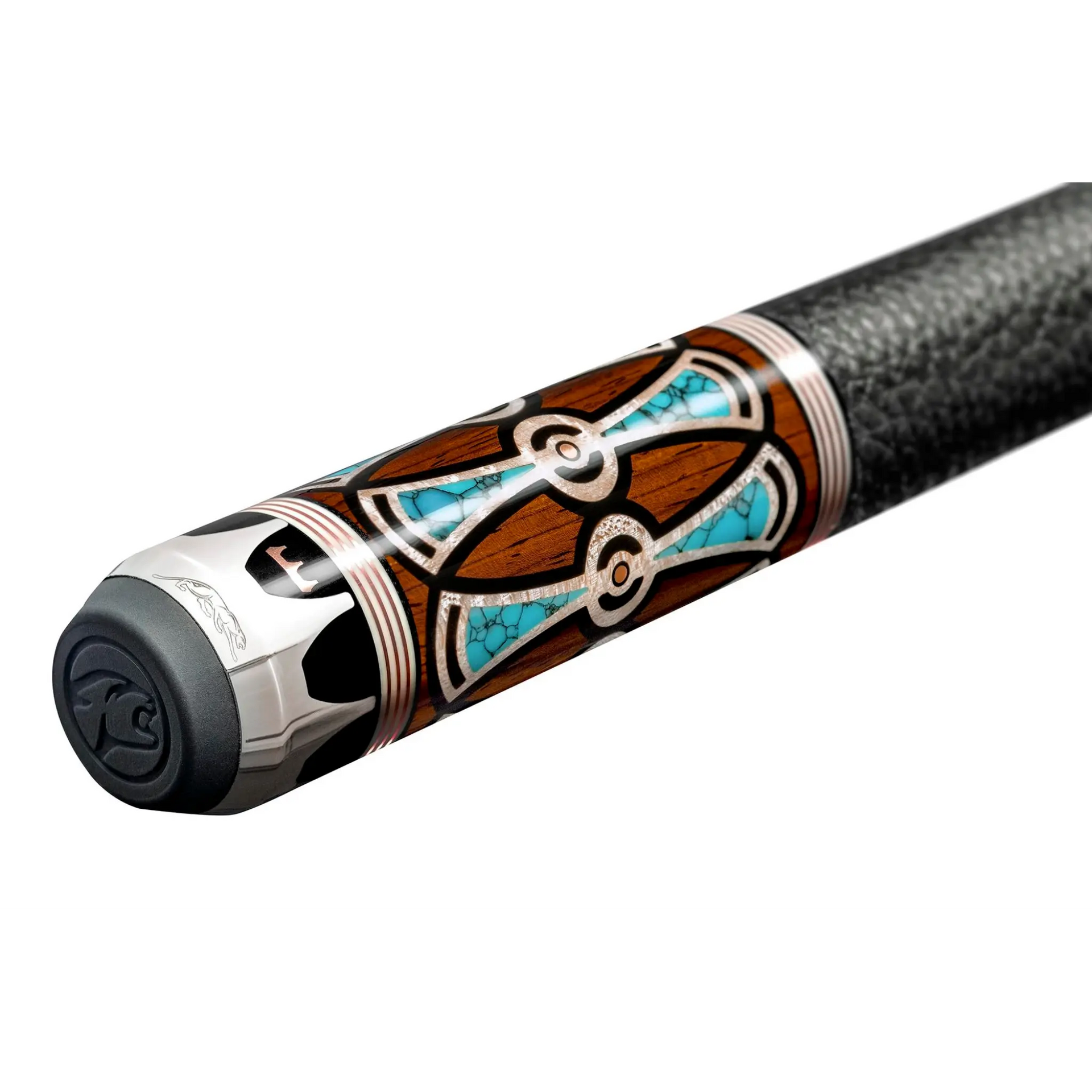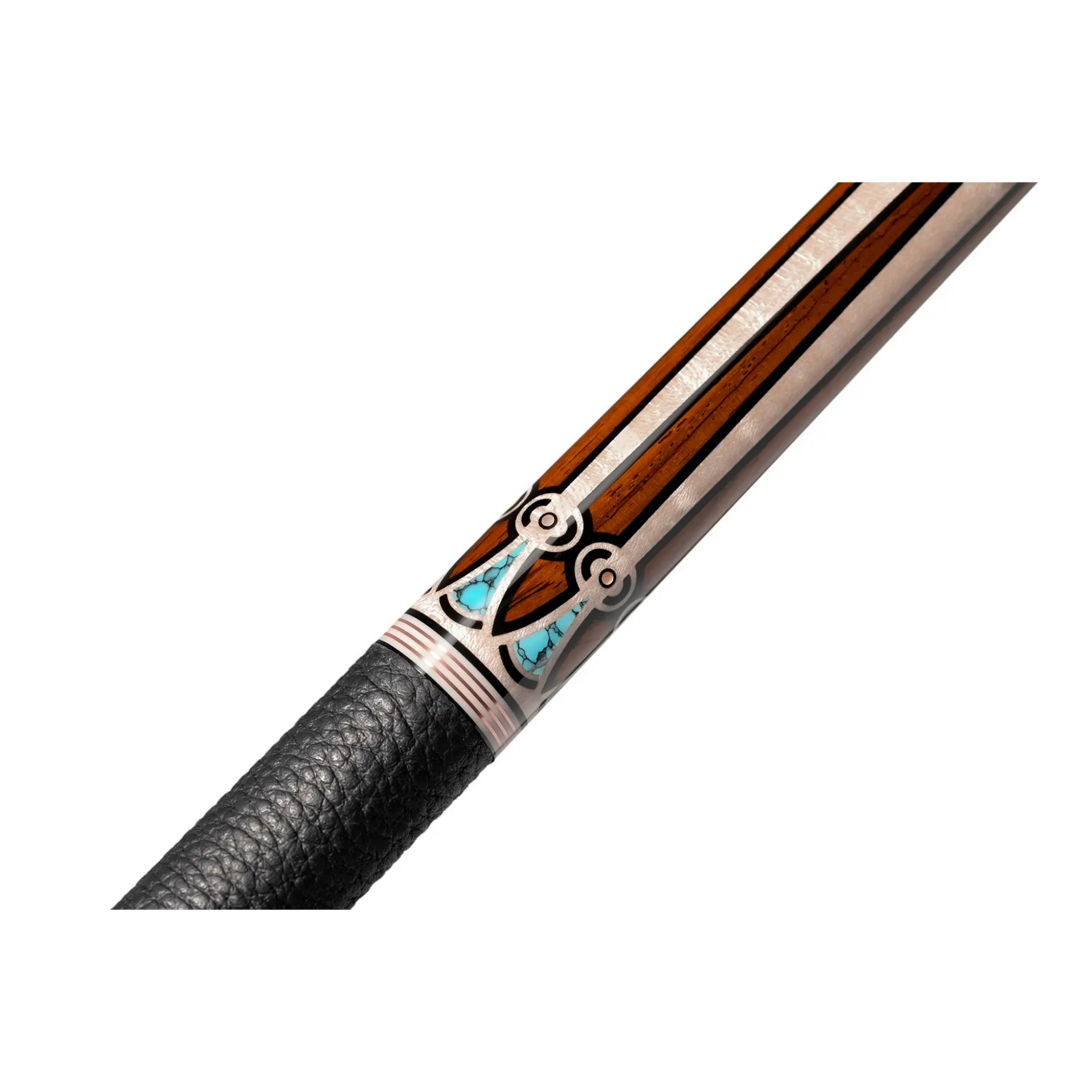 The warm Cocobolo butt sleeve includes Natural Curly Maple and Turquoise inlays with Rose Gold accents, maintaining a balanced, premium design.