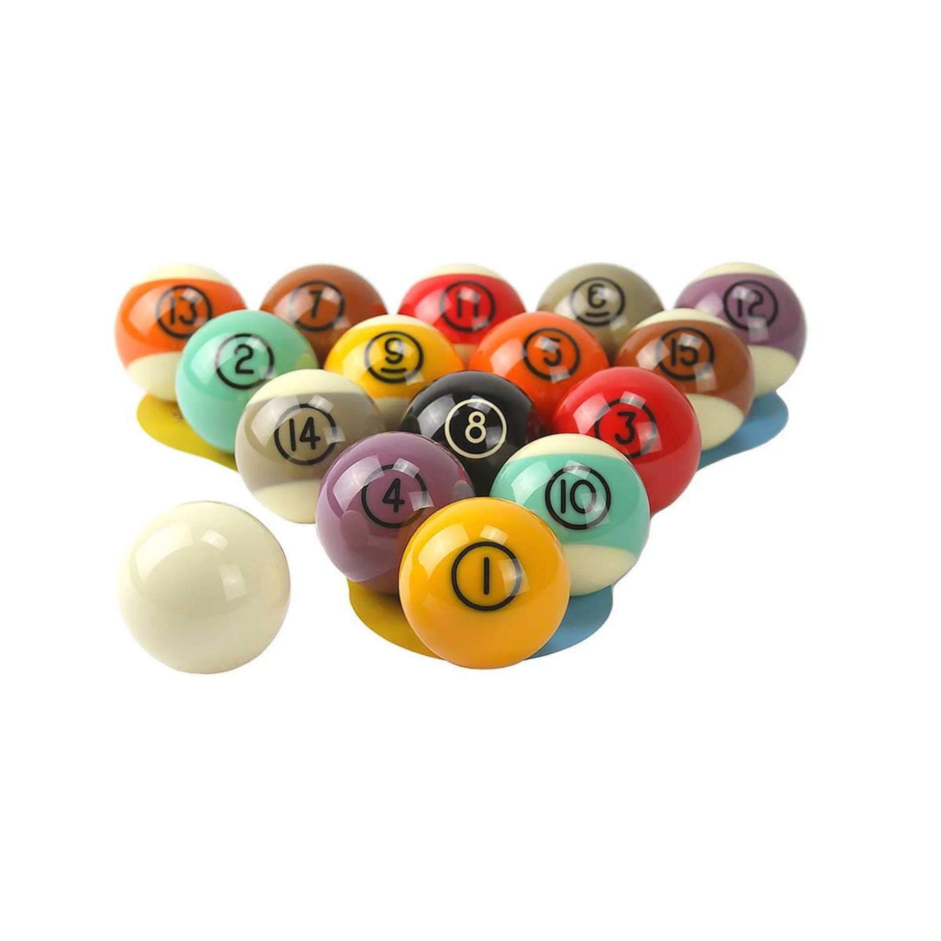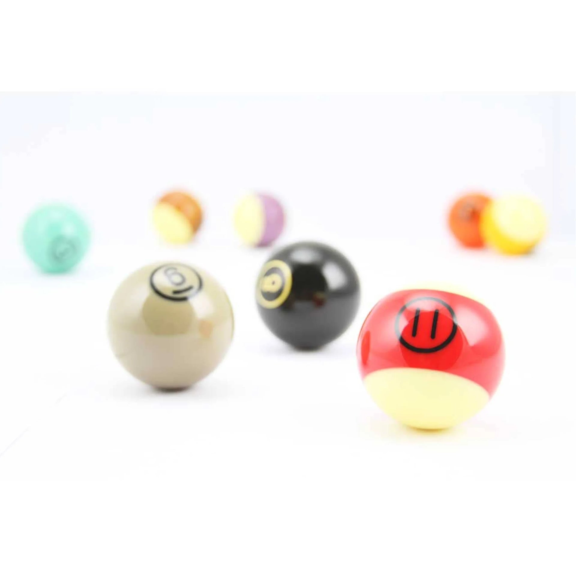 Este jogo de bolas Tungsten 572 contém 8 bolas lisas, 7 bolas riscadas, 1 bola branca e um pano de limpeza.